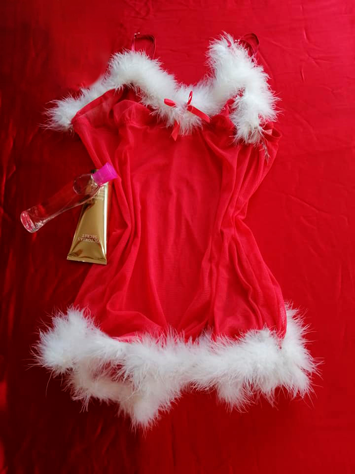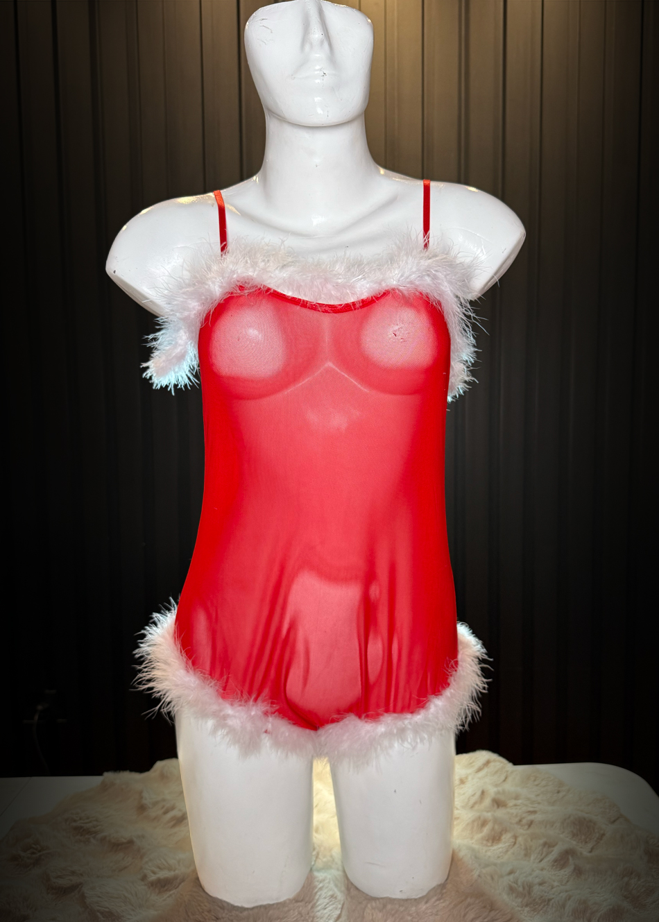 Dulce, atrevido y perfecto para la temporada. Este babydoll rojo con delicados detalles de plumas blancas evoca el encanto navideño con un toque sensual y divertido.