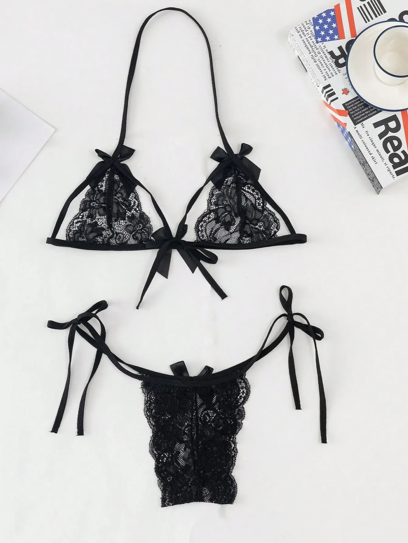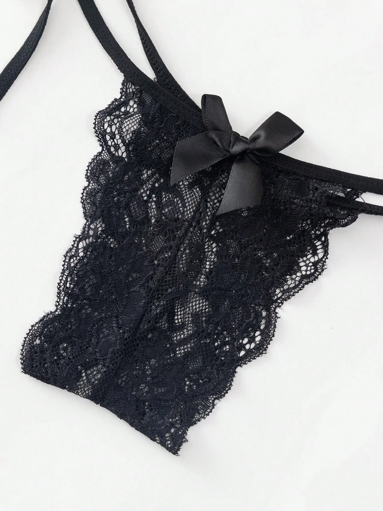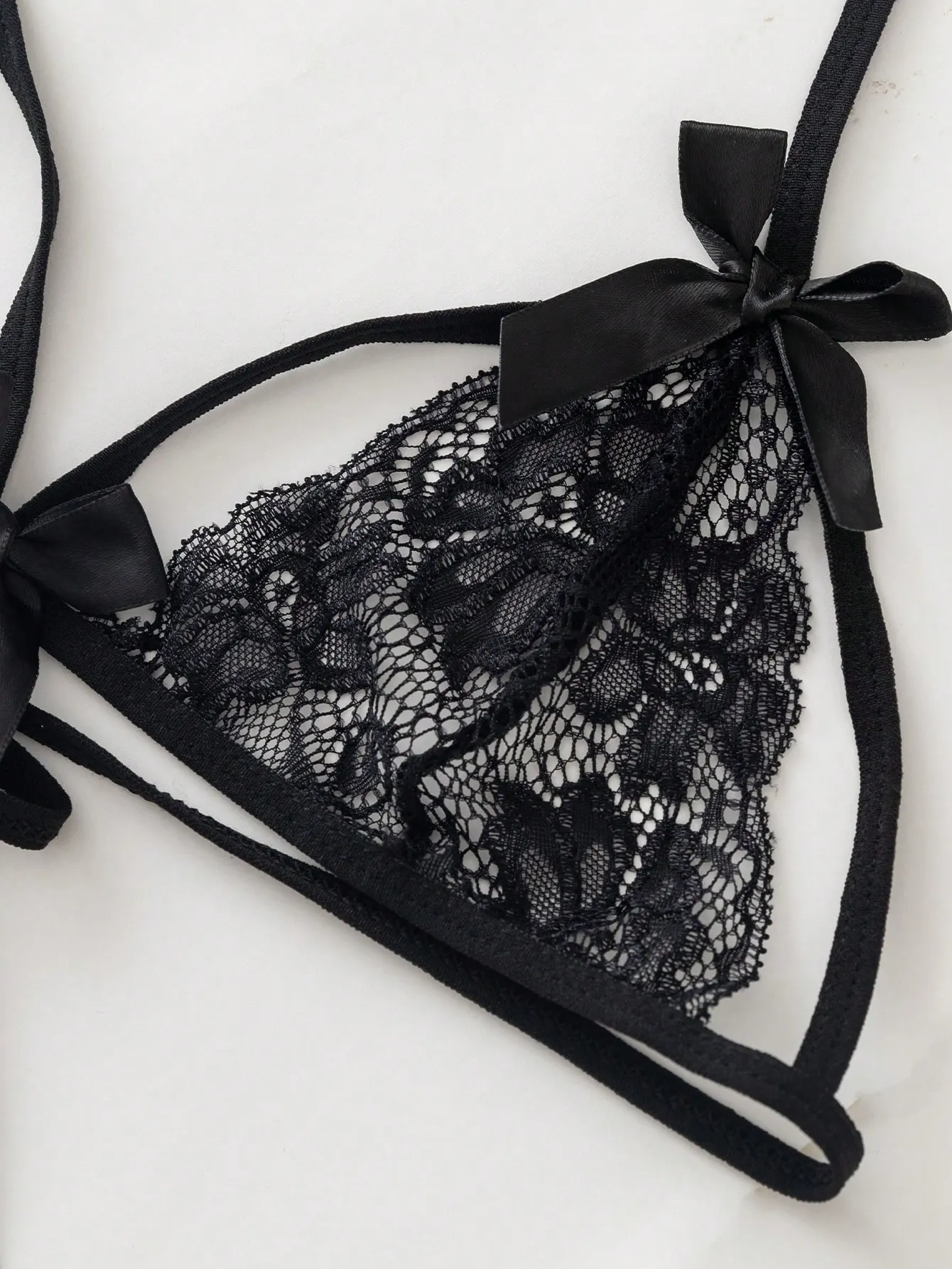 El bralette triangular presenta tirantes finos y detalles de lazos satinados que aportan un toque coqueto y sofisticado.