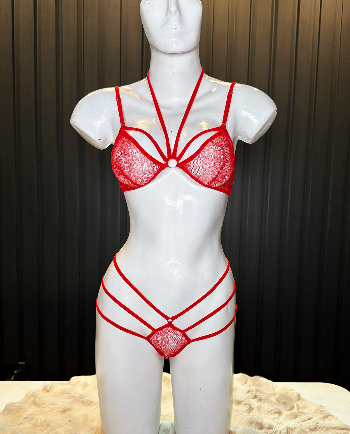 Conjunto de lencería sexy de encaje floral traslúcido, color Rojo