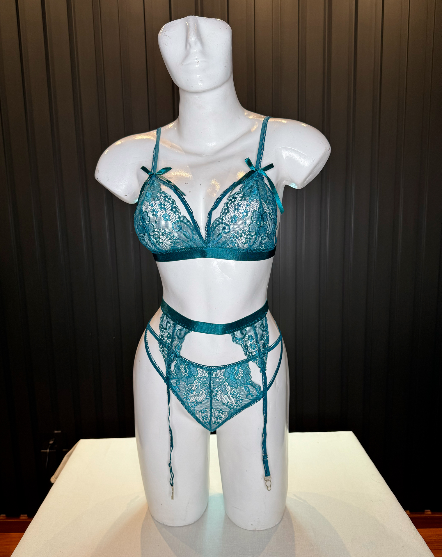 Elegante, sofisticado y absolutamente cautivador. Este conjunto en tono verde esmeralda combina encaje floral delicado con transparencias sutiles que realzan la silueta con un acabado refinado.